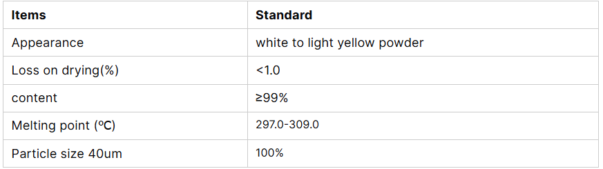 Substantzia solido kristalino zuria da, uretan eta disolbatzaile organiko batzuetan disolbagarria. Egonkortasun termiko eta kimiko nahiko altua du.